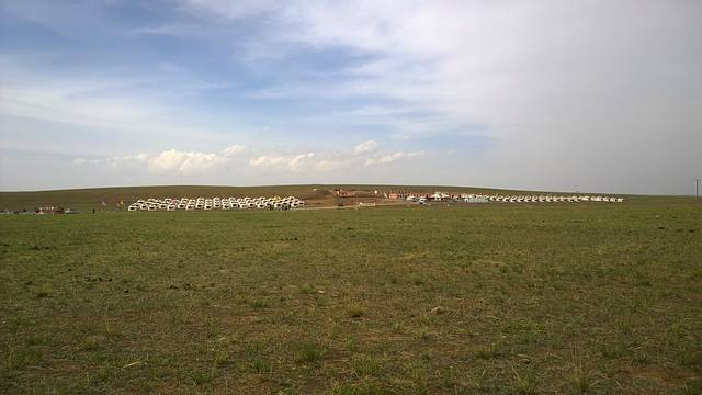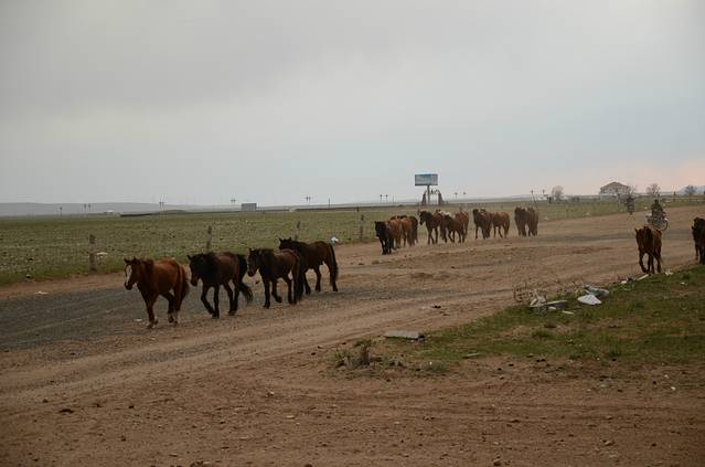 中午到达武川后,找了一家莜面馆,吃了一顿内蒙地方菜,发现好不一样,这顿饭在我好奇中吃完,发现好饱,真担心会骑不动车,补充了水以后,我们又上路了。当我们还剩几公里就到草原的时候,突然感觉我的车好沉,以为是上坡没管它,又一想着是下坡,一看后车胎扁了。呜呜,开始修车,伤心总是难免的,还好会长的补车本领很好,不一会就补完了,接下来一口气到草原。