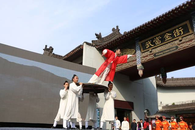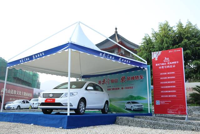 次间一早准备攀登金顶,在景区门口搭的舞台上看到一群白衣的年轻道士在气势恢宏的耍太极,后发现这是武当山举办的游山奖车第一次抽奖活动。
