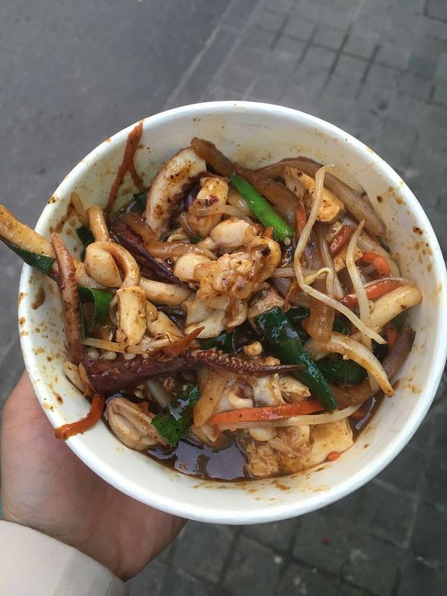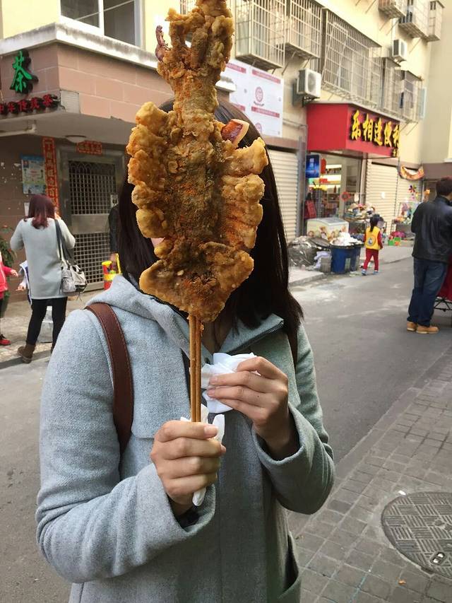 大鱿鱼,真的很大,我觉得我脸就够大的了,比比就知道它的大小了,不过,一吃才知道,外面最大的那一圈其实是面粉啦!味道也还可以。