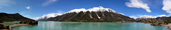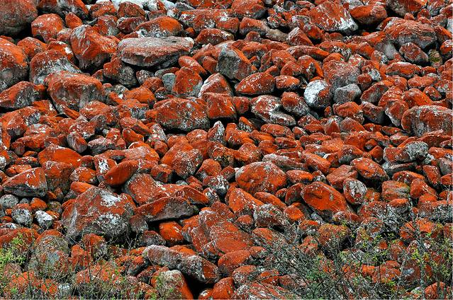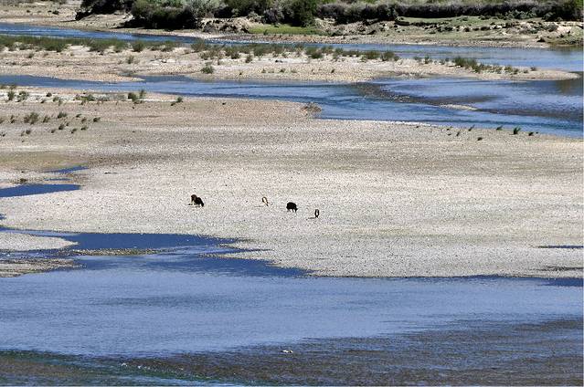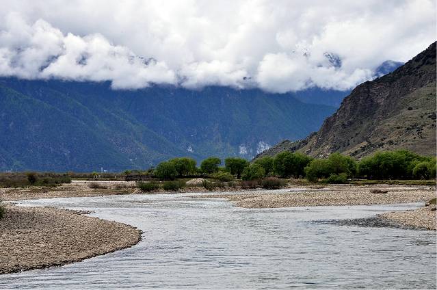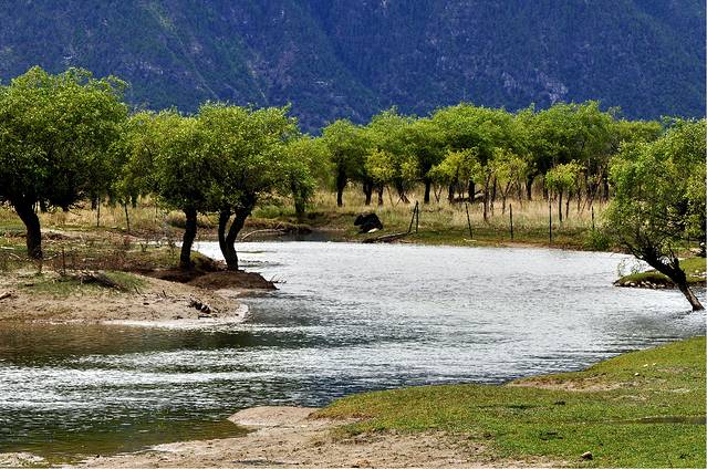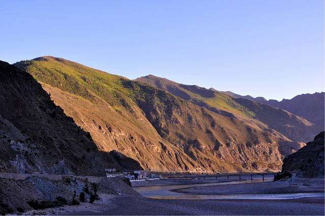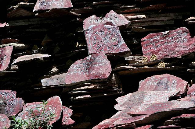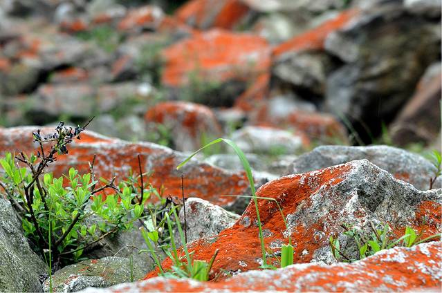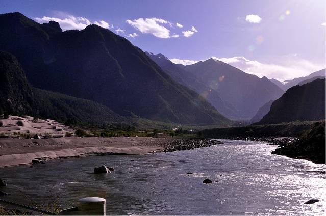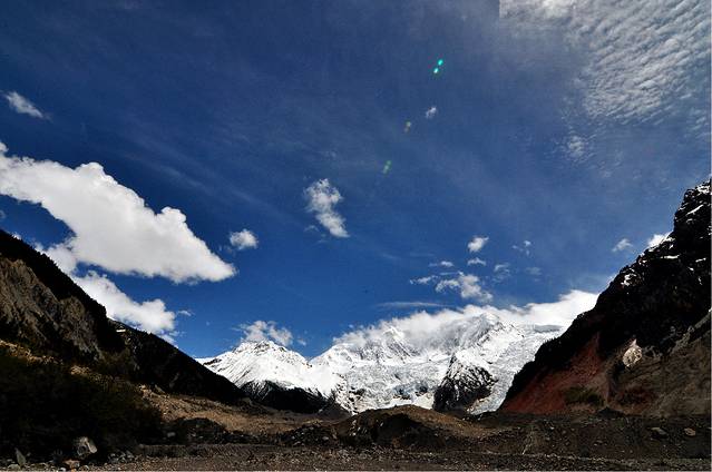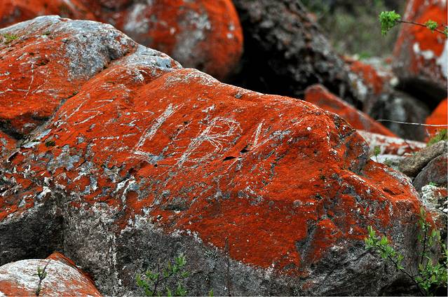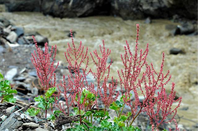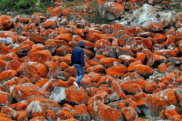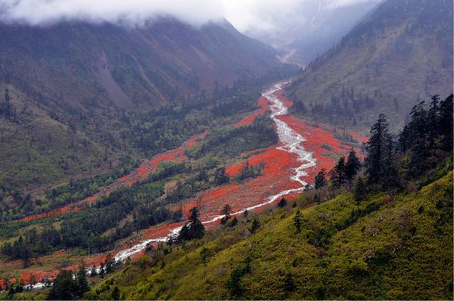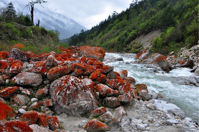 贡嘎山下的红石滩,果然壮观,车行一路,两边都是莫名其妙的红石头。司机解释,那是因为冰川地带的冰水溶化后将许多石头冲下来,加上这一段的特殊地理位置与气候,一种红色的藻物就寄生在河床边的大大小小的石头上,风吹雨打不变色,一年四季不动摇,真让童鞋们感叹大自然的造化与神奇。
