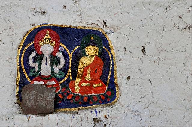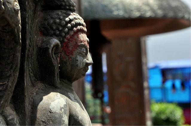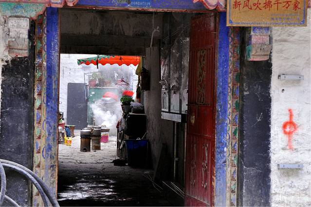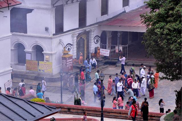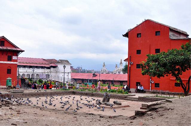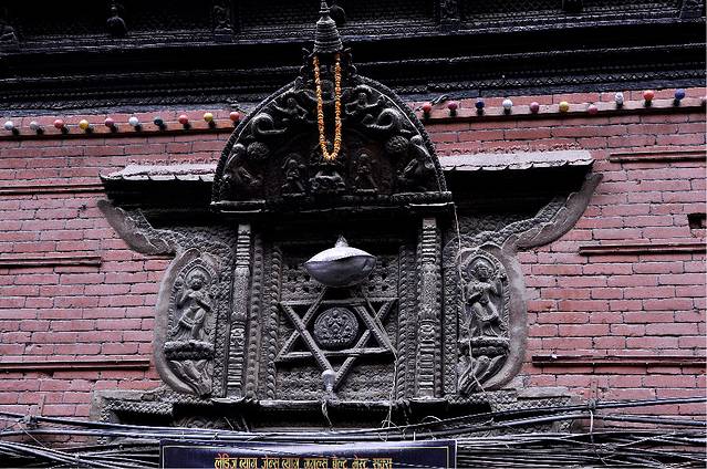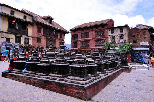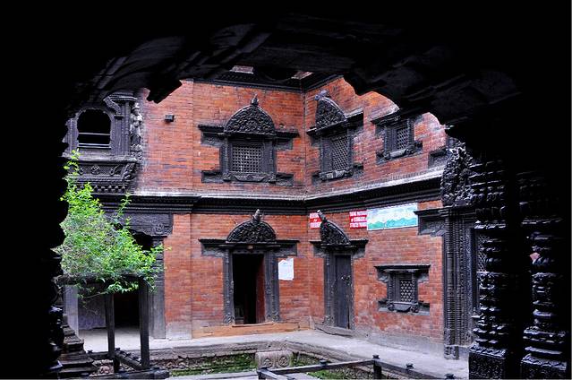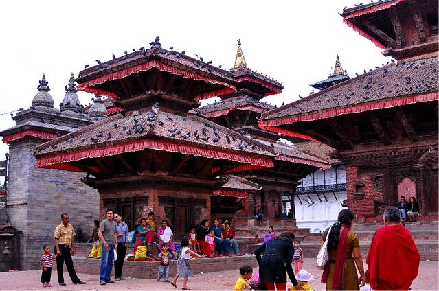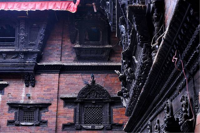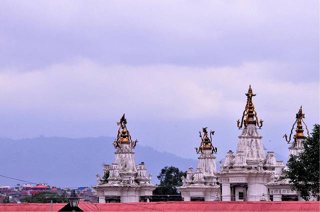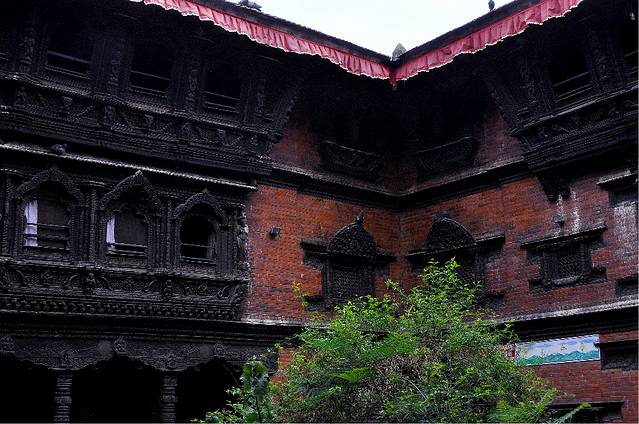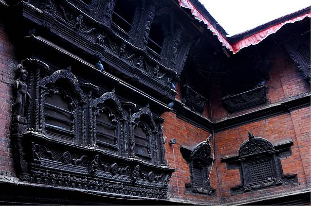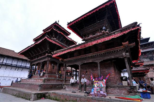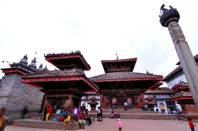 先去帕坦的杜巴广场。加德满都谷地有三个杜巴广场,我们先打的去不远的帕坦杜巴广场,司机叫价500尼币,最后300成交,车子走了约15分钟的样子就到了。景区需购买门票,500尼币,当地人50尼币,反正外国人是当地人的十倍就对了!进入景区后就像迷宫,满眼都是卖工艺品的,找不到皇宫或广场的样子,俺俩又没方向感,只好瞎走,边走边看,反正到处都是古老的建筑,人也没有加都多,道路也比加都干净了许多,心情也就平静了许多……瞎转着也让我们找到了“金寺”,又交了50尼币进入参观,很小的一间庙宇,乌烟瘴气地,拍照后从另一处门出来,没走多远就是这里的杜巴广场了;这时天空乌云密布,下起雨来,我们只好躲入餐厅喝可乐去随便小休。
