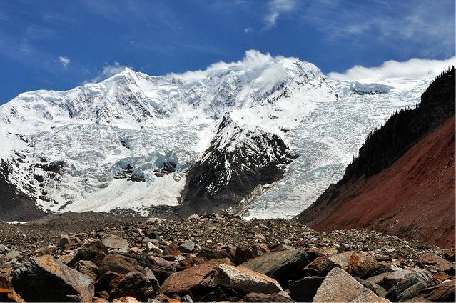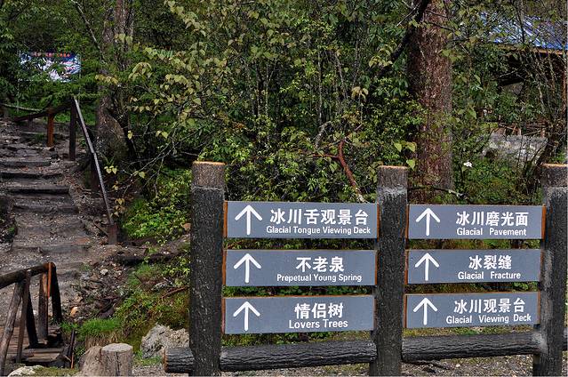 说一下这个海螺沟的景区门票和收费:上山的观光车包来回70元;门票82元;上山看冰川索道150元;另外有当地人说可带你去看非常漂亮的蓝色大冰川,需另付导游费,5-80不等,据说这个景点一般人去不了并见不着的,好像被他们藏起来成私人的了……俺们三位女童鞋就被忽悠过去了,1.8公里的石头路爬得俺上气不接下气的,好不容易爬到能看到大冰舌的地方,却没见有冰,只有远处不知名的雪山,然贡嘎山峰的影子更不知道在那儿了……当地人还想继续忽悠俺仨,说再走10分钟就能看到蓝色冰川。俺们决定不上当了,那漂亮的蓝色冰川估计在眼前这座山的后头,来回至少都要一小时以上,俺还要赶11:30的车下山呢,别搞我,回头吧,俺不看“漂亮的蓝色冰川”了。