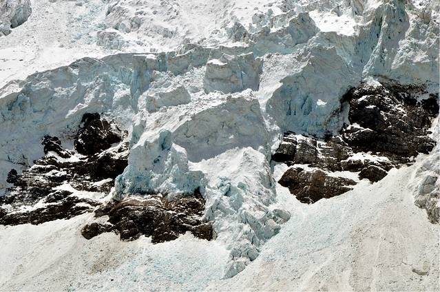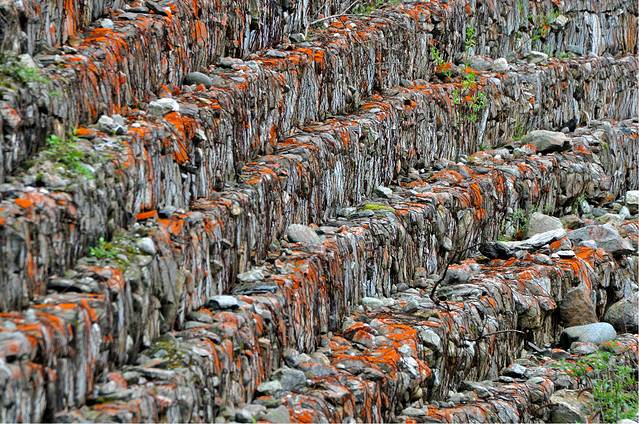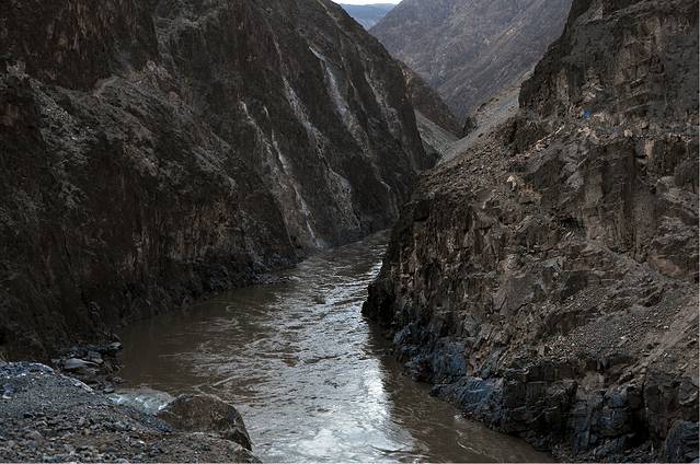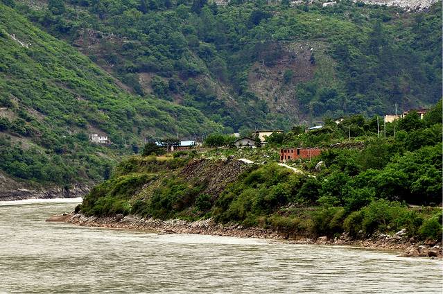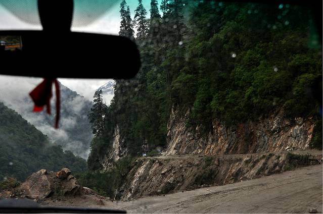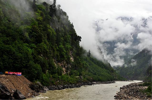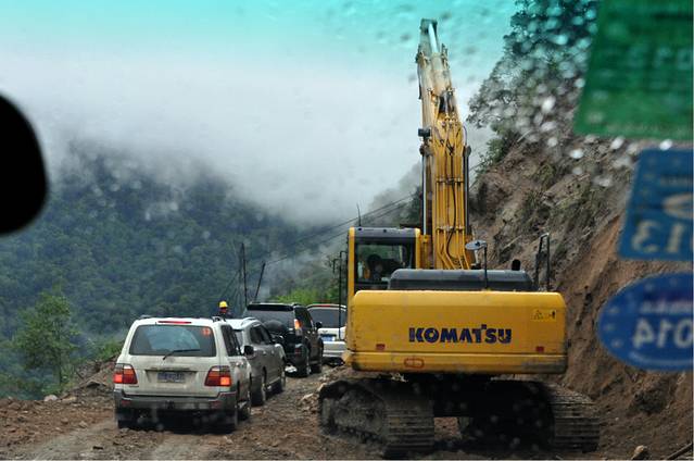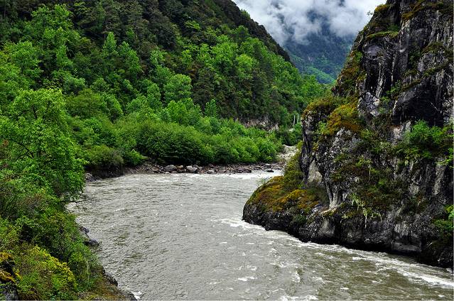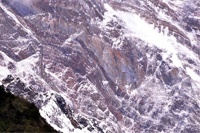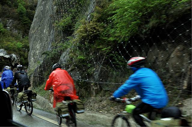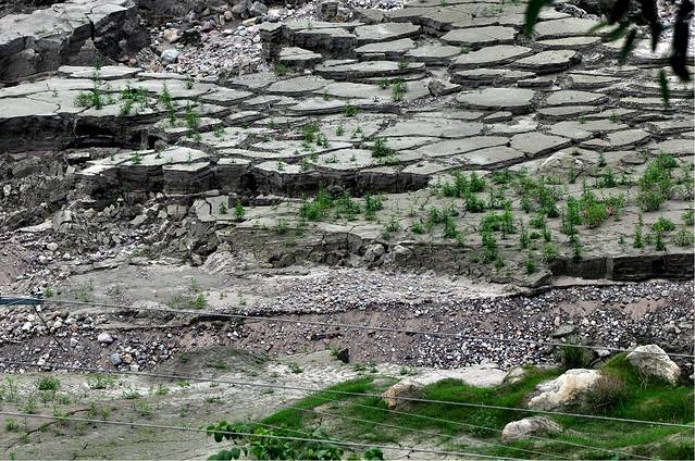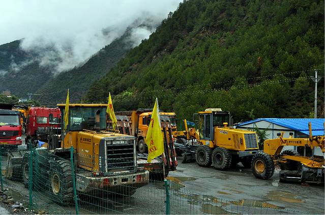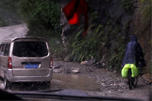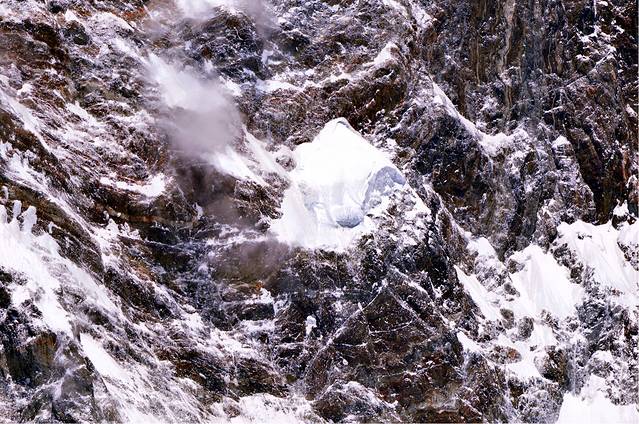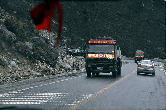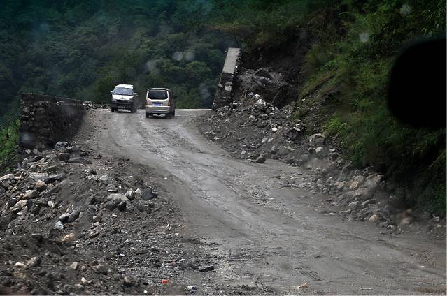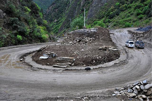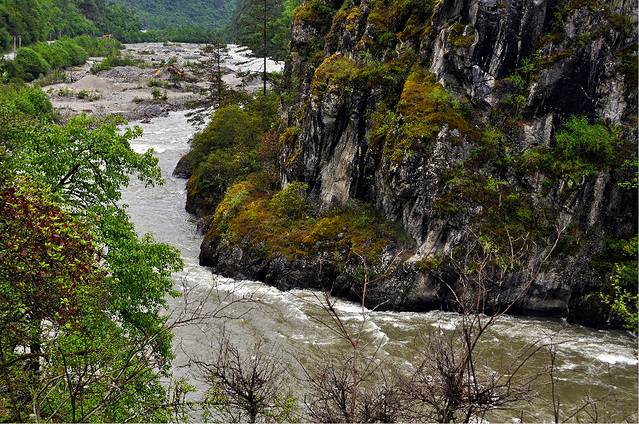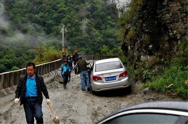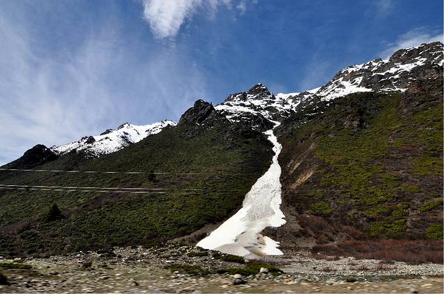 一路沿成雅高速走,绕过刚刚地震过的灾区雅安和芦山,穿过全国最长的“泥巴山”隧道和N个不记得名字的大小隧道后,老天停雨了,但依然是阴天,山上的水分很重很大雾。在石棉用完午餐后继续往海螺沟方面行驶,这段路就很要命了,山上的碎石落在本来路况就不太好的路上……沿途一直跟着大渡河走,从河对岸能看到从山上滑下来大片大片的碎石和泥巴,不知这算不算是泥石流,将河水搅的浆黄浆黄。