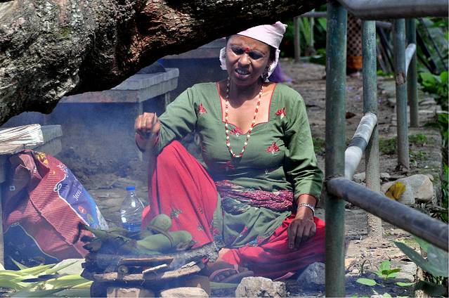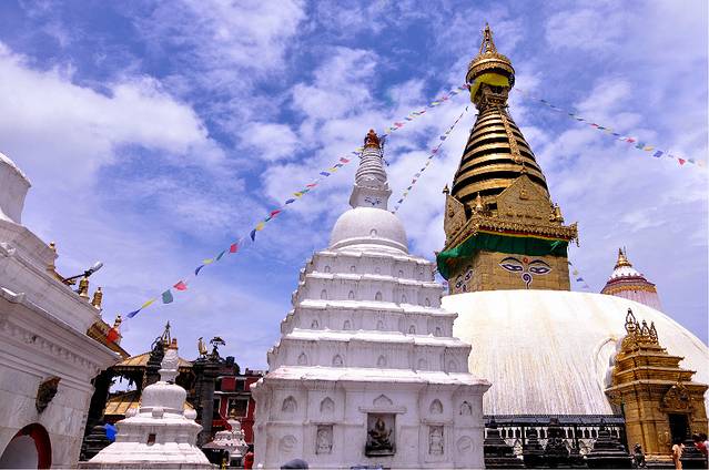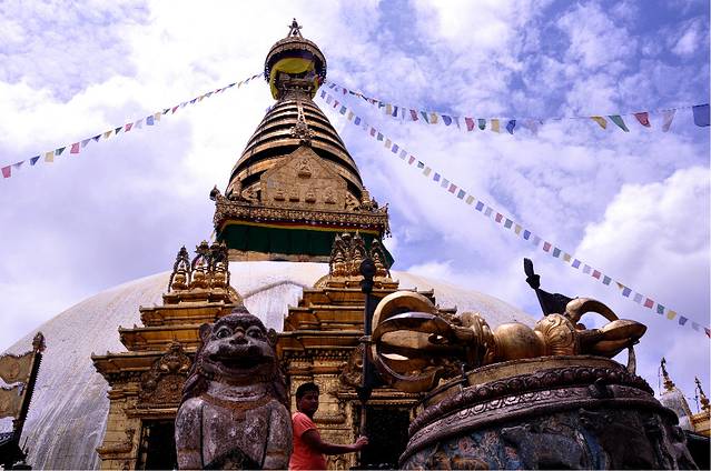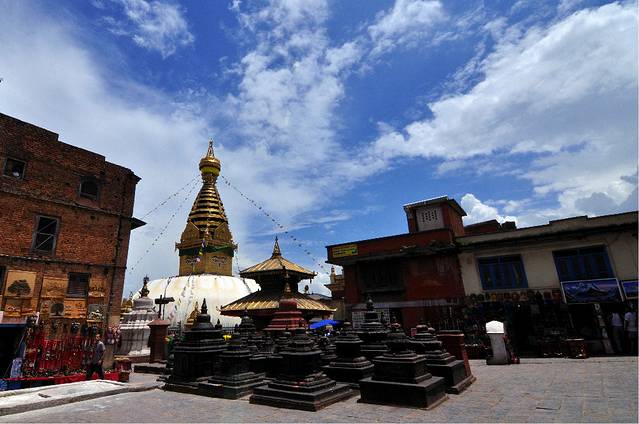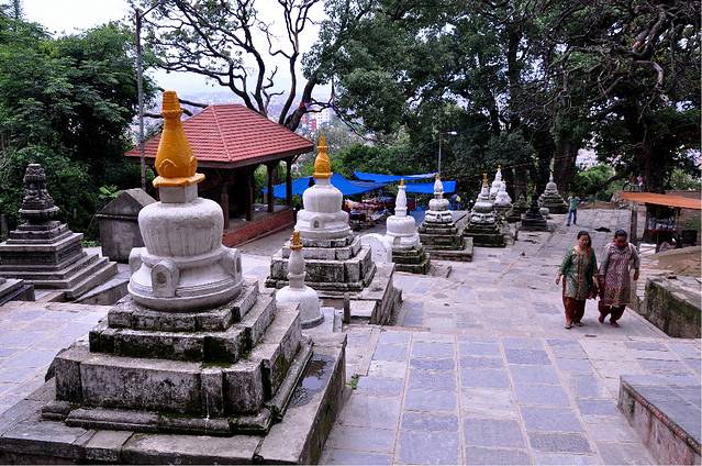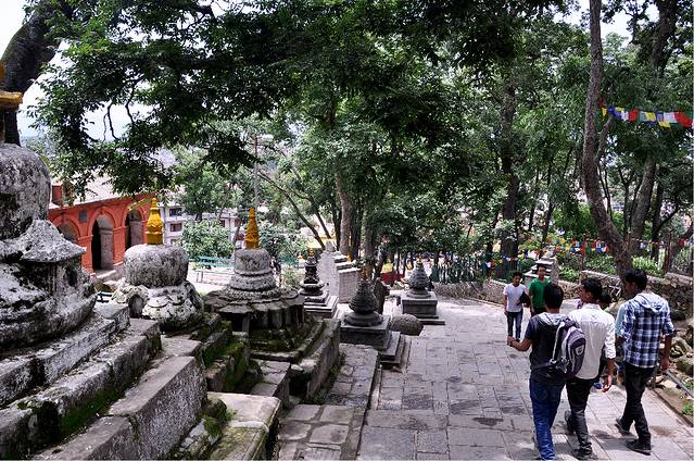 200尼币打了个的到猴庙,据说这里也是世界文化遗产,门票要200/位,后来俺们发现在三位大彩佛的右边有石阶上去,那里不需要门票。这猴庙没什么特别,也没有想像中的漫山都是猴子,就是在山顶有座大白塔,四周可360度环观整个加都,很晒,有山风吹过倒也还舒服;山上有祭师为人们祈祷,看了半天没看懂他们的仪式,感觉就是脏脏的,牛奶从头上倒一点下来,一群狗儿就顺着沟渠在喝,每个人手上都脏兮兮的;还有那满大街的乞讨者,多数都是妇女抱着很小的孩子,伸手向你讨钱,有时俺光顾着拍照,冷不丁有人碰碰俺的衣角把姐吓一跳,然后再看到她们的脏手真是想钻到地缝里,她们还锲而不舍地追着你,不停地碰你的衣角,真是好讨厌好讨厌……这么多的乞讨者,你又能给几个?还是逃之夭夭吧。