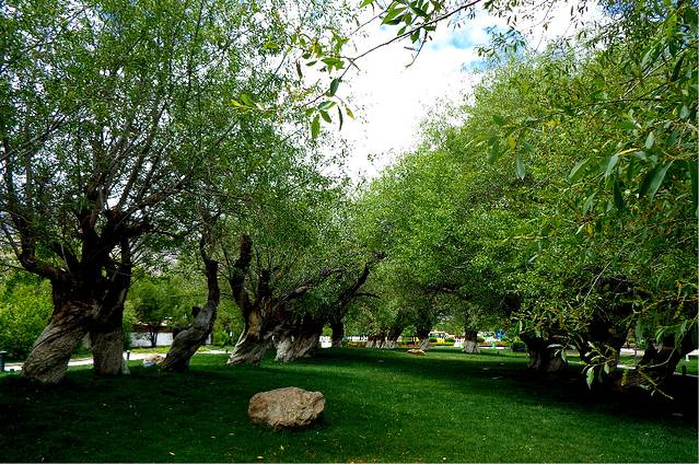 湖中有个湖中岛,山上左边那个尖尖的白塔就是著名的“和平塔”