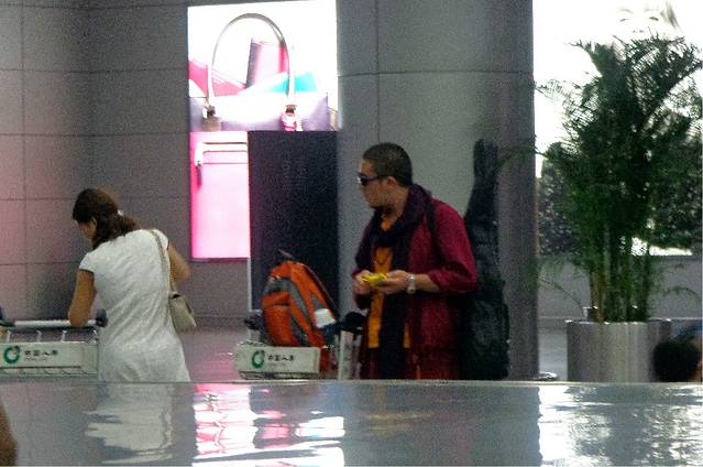 在百度上学了一下“机场”的单词,到旅店门口和的士司机比划了一下他马上就明白了,开价要姐500尼币,最后还到300;十来分钟就到了,姐将仅剩的500尼币交给他,还竟然没零钱找,害俺无端去消费一条香口胶找零,花了俺100多尼币,进入机场后俺口袋里只剩105元,还不够买一杯咖啡喝的……虽然俺一点不懂英语,身边也没了90后们,但找到国航柜台办电子机票并不难,只需要将护照交给他们就是了;工作人员比划着告诉我,到成都后需要自己提行李“out”完后再"in",俺表示明白。出了机票就是例牌的安检、过关、找登机口等候,就这么简单。
