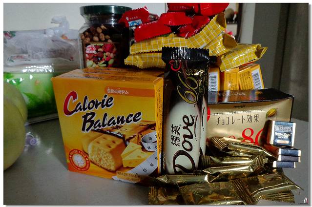 德芙黑巧克力、韩国压缩饼干、若干夹心饼干……