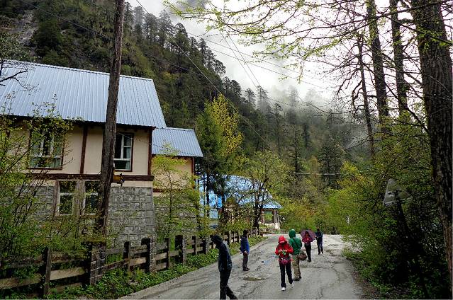 路上我们试图说服司机不去海螺沟(可以选择去丹巴的),未果。司机说那里路更难走,然后只是去看个藏寨,没啥子意思……结果,我们被忽悠进入了海螺沟,由海拔500多米一路去到2800米,来到三号营一家叫“银山宾馆”的客栈,鬼影都没一个,房间内很潮很冷,还好有电热毯……