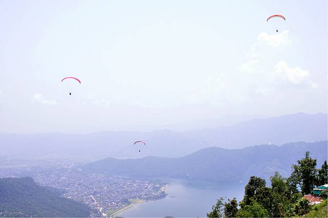 哦,酷哇!在山坡地上,穿戴好滑翔设备,教练在俺肩上挂了个不停发声的鸣声器,我估计是计算客人心率心跳的东东,因为后来在空中教练不时地问俺O不OK,应该就是根据客人肩上这个家伙发出的声音来判断客人有没害怕或其它不适,毕竟是在空中,可不是闹着玩的,虽然我们就是在玩……白羊座的俺对这些刺激的活动从来不抗拒不害怕,即不畏高也不腿软,教练让俺在坡地上跑了十步不到,我们就在空中飘了起来,身外四周空空地,很爽很自由,真地像鸟儿一样飞在了空中。教练不断控制着两边的绳索,有时还用脚蹬几下,像在踩单车,然后滑翔伞带着我们在空中自由飞翔,在博卡拉的山谷中飘来飘去,一会儿升高,一会儿降低,转弯、摇摆,做着各种动作;有时一阵山风吹来,会把我们吹到远远的地方,好像不受控制般地乱摆,这时教练就需要很熟练地将伞控制住。由于这项活动还会全程录像和拍照,所以每位教练还带有一台小小的摄影机,伸出空中1米多远,时不时地让俺对着镜头摆微笑的甫士;说实话,纯粹地飞行别左右摇摆,姐一点事没有,但教练一摇摆,哦俺的胃,就很有点受不住了;这时俺只能靠深呼吸来挺过去,他一摇摆(也不知是风吹的还是他故意的)俺就深呼吸,当然他也不停地问俺O不OK,我忍!我OK!其实心里真恨不得他赶紧回程,却又不甘心飞不够那40分钟……