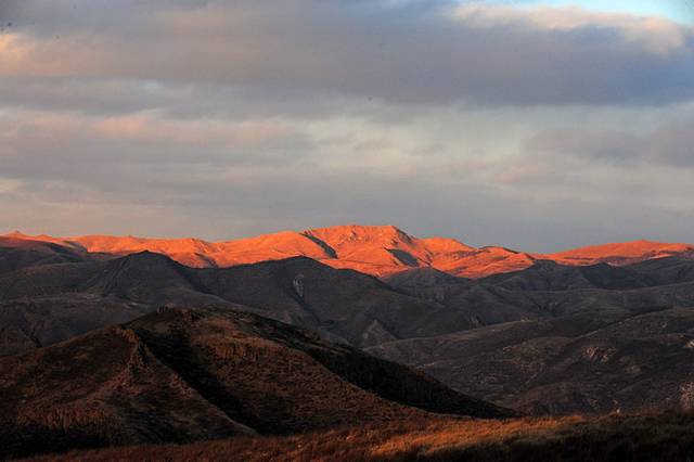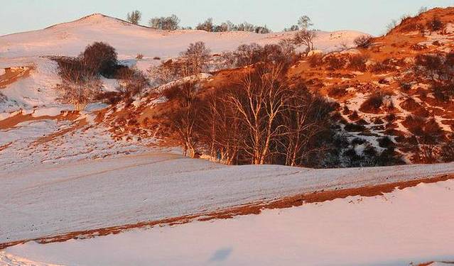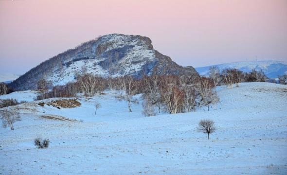 看完了日落景象后,驱车走在小红山到将军袍子的新建成的柏油路上观赏景色。天边是玫瑰色与大地银装浑然成一幅幅动人的画卷。