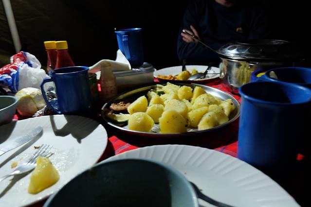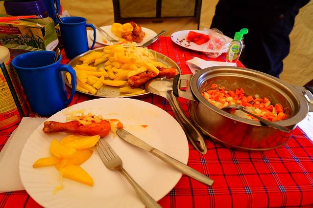 12点醒来之后,肚子超级无敌饿,各种有饿又渴,抓到个小黑就问他有没有水和吃的,厨师帮我弄了甜的粥,其实没有很爱,倒是菠萝和西瓜让我整个人瞬间活了。然后开始启动处女座模式,拿湿纸巾各种擦,擦脸,擦帐篷地板,擦包,擦鞋…迅速打包东西,我要赶紧离开这地方,不然我感觉我肿得都要爆炸了。