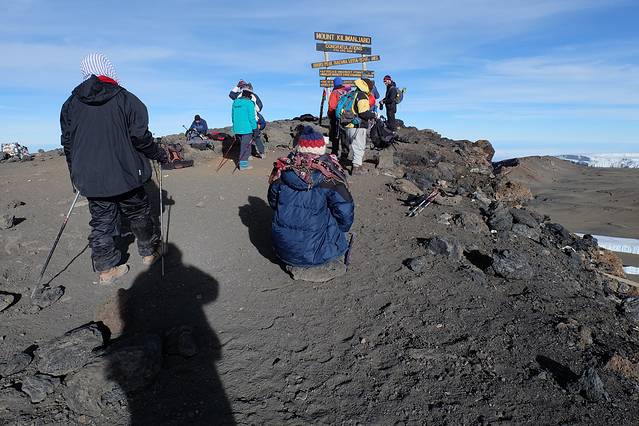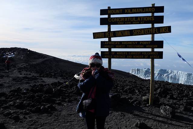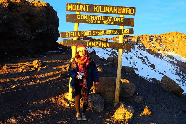 午夜登山,我想上帝一定在想,好多亮亮的毛毛虫在爬山哟,刚开始还好的,只是在高海拔登山,大家行动都好像老爷爷老奶奶走路,很好笑,接下来爬着爬着就开始不好笑了,抬头看到好高的地方有灯光就知道了,好高好高呀。身体不知道从什么时候开始就开始胃不舒服了,原来是高反袭来了,中间的惨状我就不形容了,反正吐了5次,几乎把胃液都吐出来了,吐了黄色的东西,上网查了一下,貌似是胆黄之类的东西吧,而且那种吐是我直接毫无处女座模式的,直接趴在地上吐;然后喘气开始很难,很难,很大口的喘都感觉吸不到的样子;然后开始头重脚轻,好几次都差点往后倒,直接掉下山去。然后我问joy还有多久,每问一次都是一次失望,好久好久,身体很难受,情绪开始变得很不好。我就告诉joy我想放弃,慢慢的变得歇斯底里,那丢脸就是我旁若无人的哭着说我不爬了,我讨厌这里,我想回家…反正joy还有路人各种鼓励吧,也不知道怎么到顶的,真心有种快往生的感觉了,快到顶的时候之前遇到的那个中国小伙还看到我,惊诧了一下,咋突然变这么弱了。然后joy指挥我赶紧去拍照,拍完赶紧下山,后面的那个最高点——uhuru就别去了。我说,让我坐一会儿,求你了,他硬是不让我坐…反正我在旁边石头上趴着思考了3秒钟,我告诉他我要去…把他可是给吓坏了,他说你现在这状态,上去要40分钟左右,太危险了,不能去。但是,我决定了,10头牛都拉不回来,反正我就是要去,去的路上吐一次,回来路上吐一次,各种吸不到气,喘气超大声,各种要往生的征兆,之前路上遇到的各种人都在帮我打气,别放弃,然后一个加拿大的女生的拥抱着实给力了一把,稍微有2分钟我是清醒的。