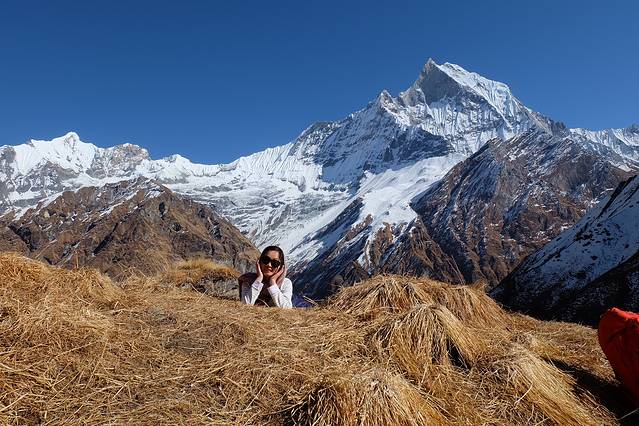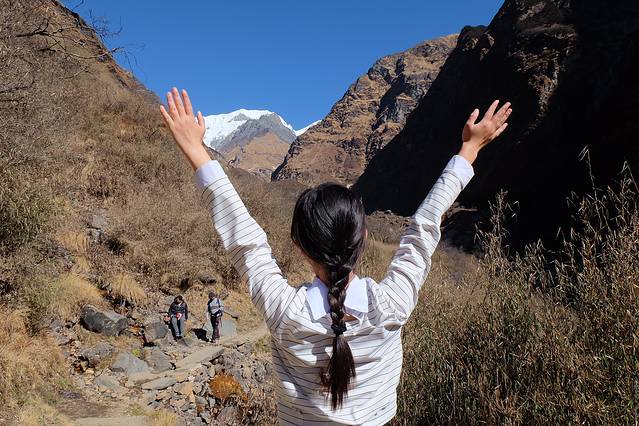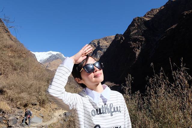 徒步第六天:早早起床,7:30就赶紧离开了himalaya,前往此次最大目的地ABC啦。一路从himalaya到ABC,尤其是MBC到ABC那段路比较平缓,所以走起来也是比较不费劲,今天这一路是各种shiba和我一起拍照,唱歌慢悠悠晃到ABC的,所以路上花费时间略长了一些。