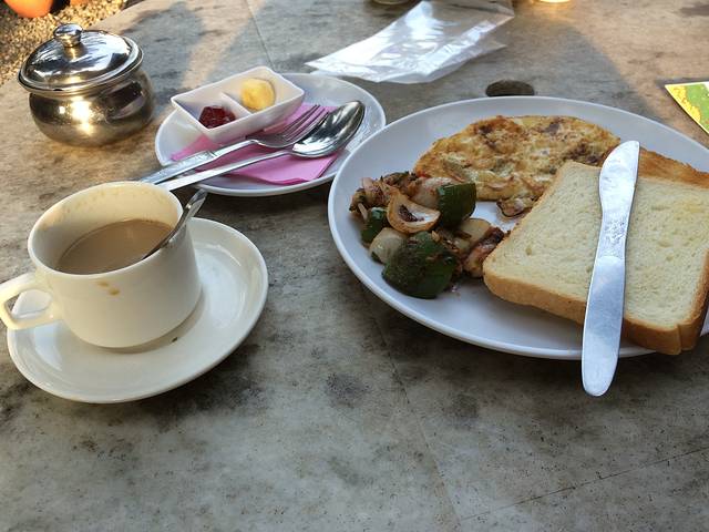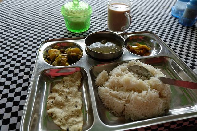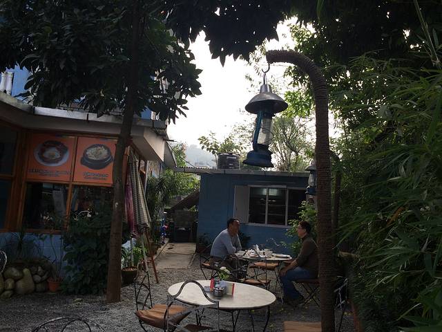 中午12:00,我们是在bamboo用的午餐,今天咱们点面面吃。其实路上吃的选择主要有几种:汤面,炒面,pizza,尼式咖喱饭,炒饭。PS:英文不好,知道的就这些了。①然后到了第三天才知道,原来早餐可以不一定吃面包或者大饼,还可以吃面的说。侬家南方人,还是比较爱吃咸的,热的东西,所以以后的早餐我就全部是鸡蛋汤面+milk tea啦。②尼式咖喱饭忘记尼泊尔语怎么说了,反正里面有蔬菜,米饭,小菜,还有咖喱。最大的特点是啥呢。里面的饭还有咖喱是可以无限次地加的,所以对于大胃口man来说是很有值的。