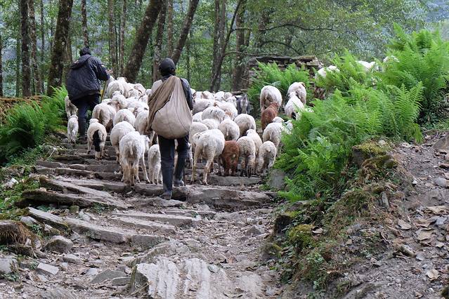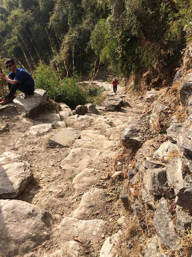 7:30am开始下撤,今天任务任重而道远,要走到chomrong,所以早早的吃完早餐就开始下撤了。tip:下山,万万记得带护膝哦~~~年轻是本钱,可是为了走更远的路,保护好膝盖真是非常非常必要的。所以护膝一定一定要带。登山杖调长,慢慢走,快速往下冲是多么愚蠢的行为呀。