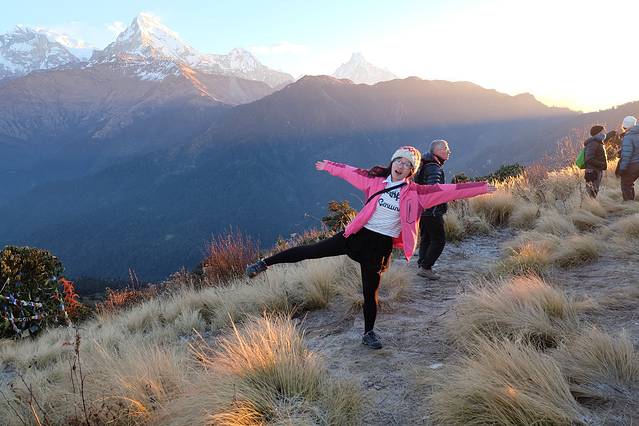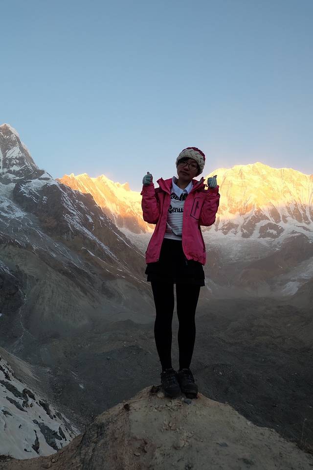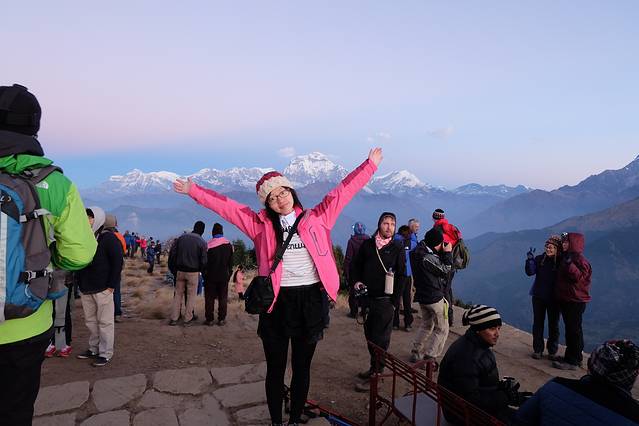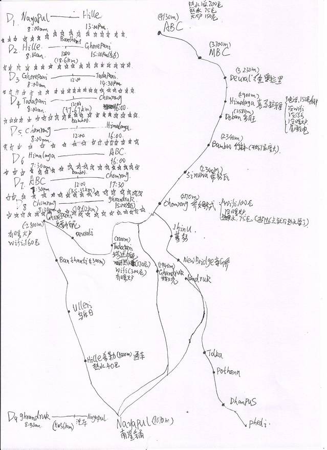 最终我妥协了,算是对家人的一种负责,或者寻求自己良心上的安心。我放弃了全程自己走,给自己最大挑战的初衷。我选择了跟一个组织——无畏山的徒步项目。项目包含了:1、从加德满都下飞机的接机,从博卡拉回加德满都后酒店送机。2、加德满和博卡拉来回的车票。3、博卡拉住宿。4、ABC+PH全程的英语向导和背夫,吃饭,酒店。全程12天的费用。线路:是可以跟组织协商的,因为我觉得自己的体力还行,所以不想走12天的路线,所以自己绘制了条路线,让向导配合走了9天。由于我是一个人,本来是说的一个人配一个向导,一个背夫的,但是后面他们给我调的是向导背夫同一个人,那个人就是shiba。(个人是没什么太大的意见,只是辛苦了shiba需要做我向导的同时,还得帮我背这么多东西,觉得挺不容易的。背夫能负重:20KG。但是我觉得人家挣的也都是辛苦钱,没必要非要苛刻的要求一定要背到20kg)PS:路上遇到的他们说我就跟向导养的小宠物似的,各种给安排妥当。一般提前一个晚上shiba就会问我第二天早餐要吃什么,几点用餐。早上起来shiba把我安顿好后自己去吃早餐,早餐吃完我们出发;走了差不多2~3个小时的时候shiba又会问我“milk tea or black tea?”;到了中午,shiba会记得在最合适的点让我停下来用午餐,一样的服务到位;每天差不多下午3~4点就会达到当天要入住的酒店,然后shiba又会帮我安排好被子,还有晚餐各种。总之,全程被形容为土豪游==在此要特别感谢像父亲一样对我照顾无微不至的shiba啦。