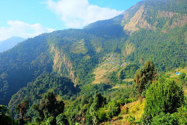 下图:看到,看到对面那座山了么???那儿就是chomrong ,姐姐刚从那座山上下来,又上了这座山,现在所在位置:sinuwa下村