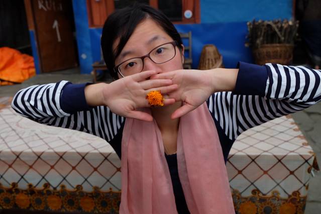 晚上的时候shiba还请我喝了当地的白酒,味道嘛一般吧,是顺口的那种,可能是因为我本来就只喜欢喝甜甜的酒,度数感觉不太高的样子,然后喝完酒之后我就更更更活泼开朗了,同一家旅馆住了一群来自新加坡的学生,貌似来交流学习了,几百号人,后面热闹的,你们能想象了么???用烂烂的英语和一个女孩大聊特聊了韩国的帅锅,偶像剧;学习了尼泊尔当地的传统歌曲resham firiri ;教当地人还有我的shiba唱甜蜜蜜。