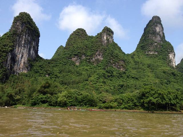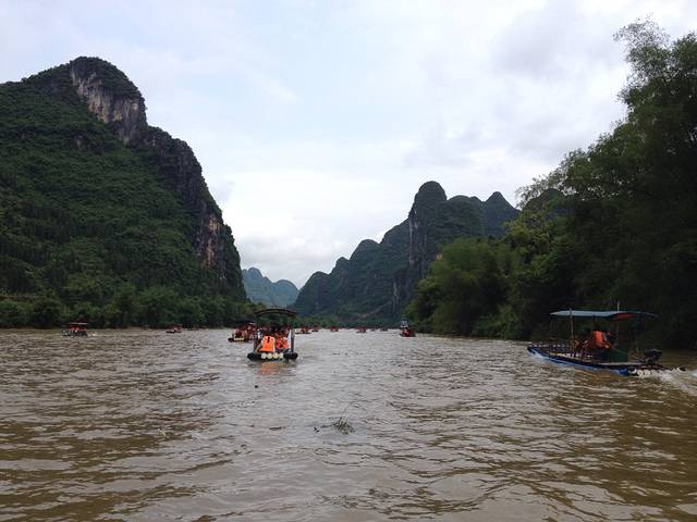 第二天乘巴士到阳朔,直接到杨堤看漓江山水。乘竹筏游漓江,是来桂林最大的期待和愿望。因昨夜下大暴雨,漓江涨水,更不利的是江水不清澈,由清澈见底变为黄河水。万幸的是,当日是晴天,没有下雨。四人一个竹筏,开始了漓江游。