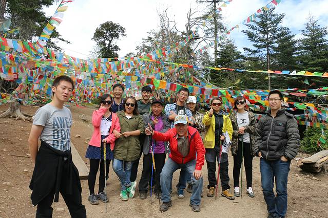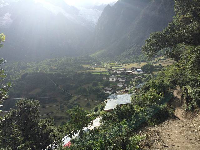 能看到日照金山的话,之后驱车2小时抵达西当村,开始徒步进雨崩,经过8小时左右徒步,抵达世外桃源--雨崩村。(我们花了8小时左右,上坡12公里,海拔2500到3800,下坡6公里,海拔3800到3100)一直走在队伍的最前头,秉持着宁可慢,不可站的心情,给自己不断的设定小目标,与大目标。(小目标就是到最高的地方一共有105根电线杆,大目标是包括垭口有3个休息站。)