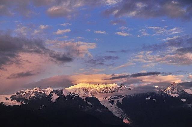 又过了一会,雪山上的云彩全部染成了金红色,但主峰仍犹抱琵琶半遮面隐藏有云层中。