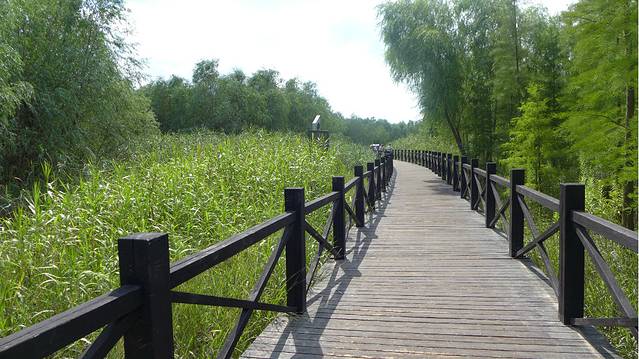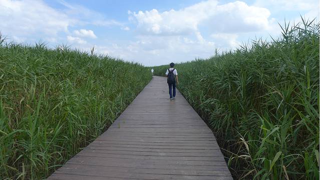 我和朋友都以为是那种两边都是芦苇荡,然后可以乘着小竹筏在中间漂流的那种,到了才发现,原来是走在一条木头道路上,左右两天都是高高的绿色芦苇,下面没有水,是类似泥地,泥地上有很多密密麻麻的小孔,里面有很多小螃萁,一路上看到很多游客拿着长长吊杆,杆子顶上有饵,然后把杆子放在小洞口,吊小螃蟹,看起来还蛮好钓的。