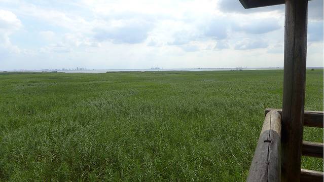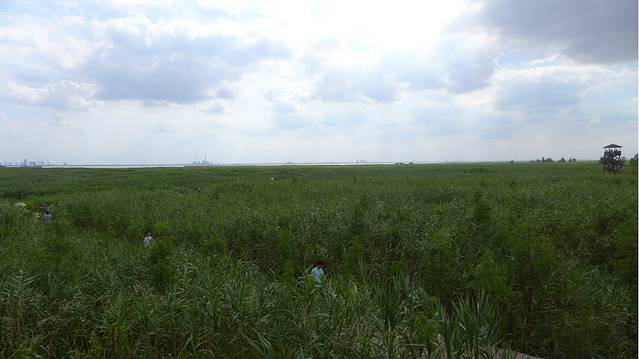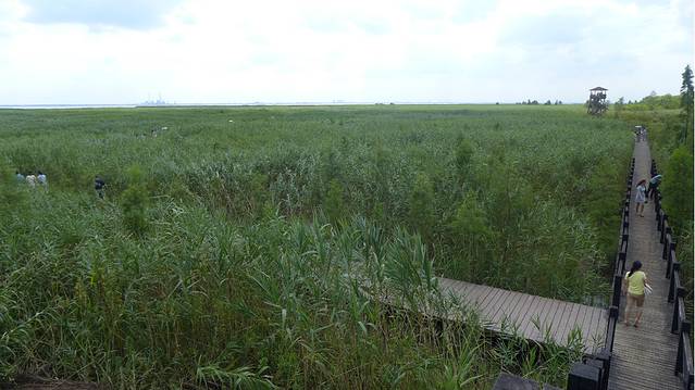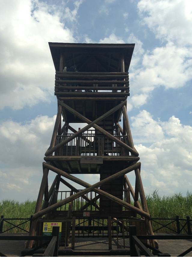 我们就沿着木道一直往前走,左右都是芦苇,走到了一个观鸟亭,楼梯登上去,视野一下子非常开阔,满眼都是苍翠的绿色芦苇,在里面行走的人变成了一个个小点,一阵风吹过以后芦苇像波浪一样一片片荡开,好美。