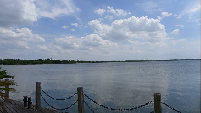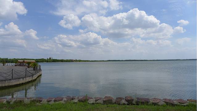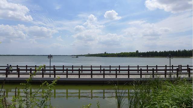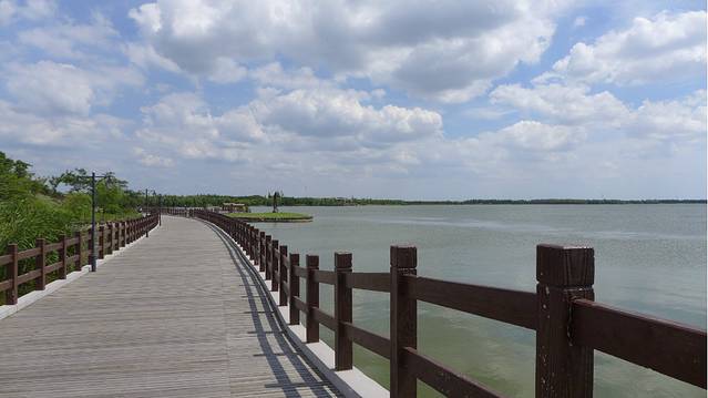 下午第一个地方是明珠湖,这里人很少。明珠湖非常大,景点就是绕着湖一圈,估计要几个小时。我们走到了明珠湖入口这边上的一条木头栈道上,蓝天白云倒印在明珠湖的湖水上,波光粼粼,视野很开阔,非常舒服。就是太阳有点暴晒,但如果不是大晴天也就没有这种美景了。