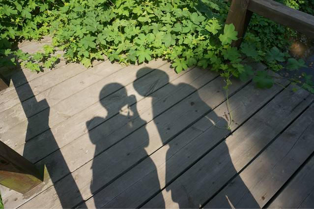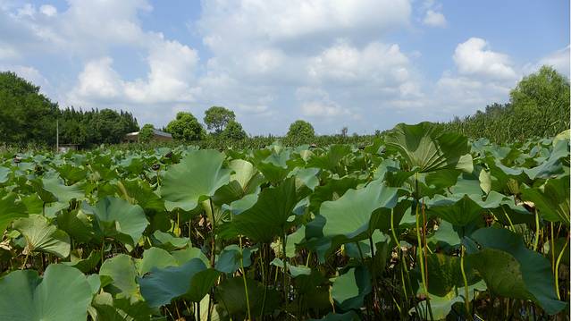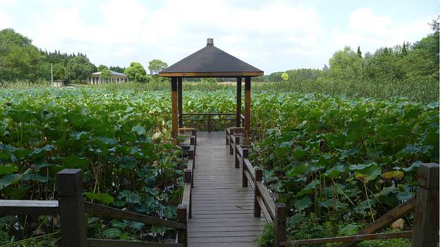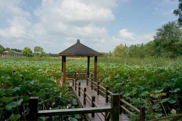 我们有经过一个小亭子,小亭子被一大片荷叶包围,在小亭子里坐坐,看着蓝天白云和满眼的荷叶,非常让人心旷神怡。