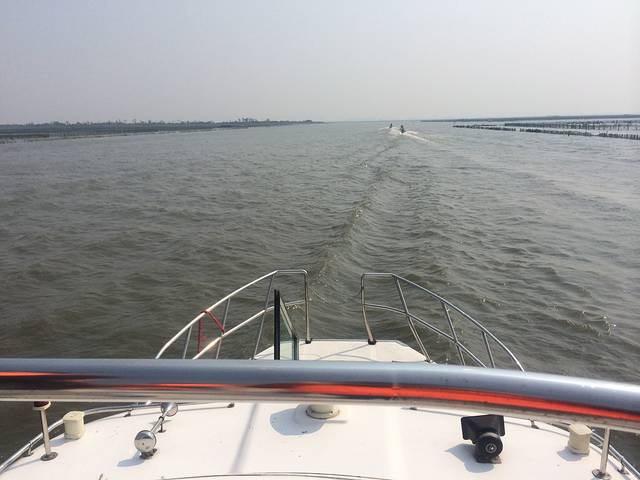这就是我们坐的船,船舱里因为都坐满了,所以我们全部人都站到了上面,穿好救生衣,风那叫一个大,所以浪也挺大,略微有点晕。