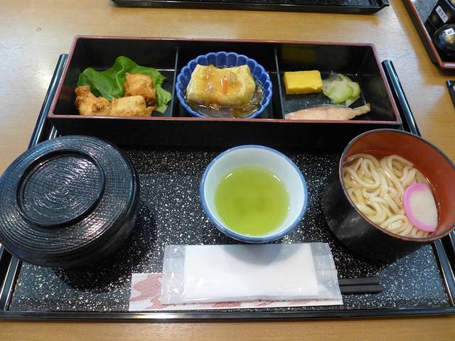 3点半集合,前往名古屋附近的爱知县丰桥市,吃定食,炸鸡块,豆腐,鲑鱼,蛋卷,又是好精致的,量有点少,乌冬面,加点辣的,非常好吃