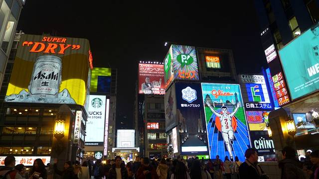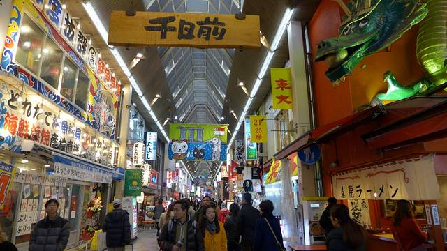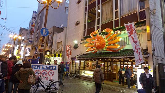 5点,到了道顿堀,心斋桥,非常繁华,各种美食,各种商店,第一家店上面有个大螃蟹,一直往前走,走到第三个螃蟹,横向的道路就是心斋桥了。