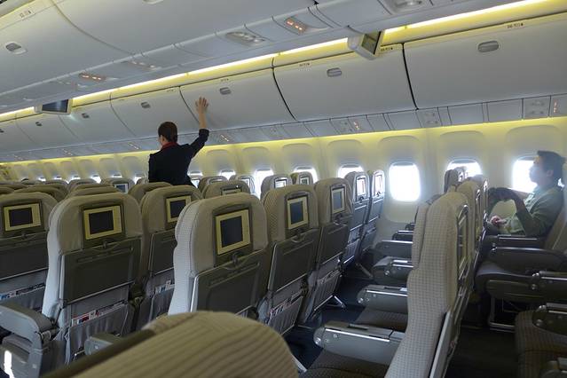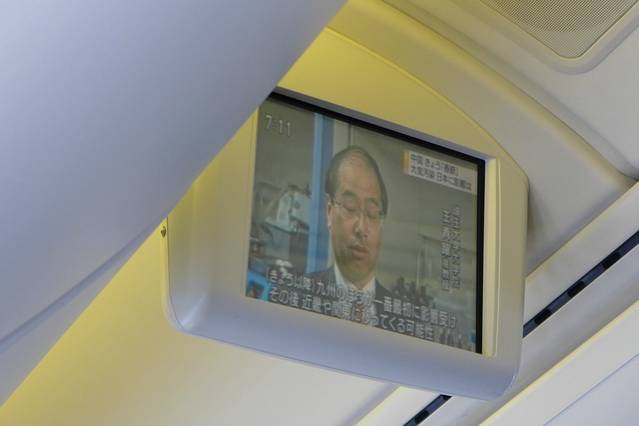 9点飞机,JAL日本航空883,我用日语和服务人员说要窗边的座位,她立刻就办理了,和浦东机场的强烈对比!飞机上人好少,包机的感觉