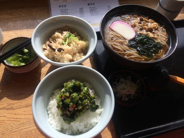 不小心点了两碗饭,失误,上面的那个蔬菜像纳豆一样是粘哒哒的,200日币,荞麦面1000日币