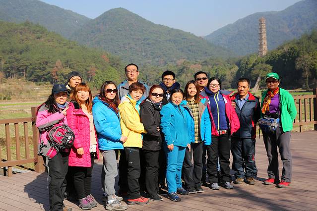 爬完山,拍完照,乘车到天台山国清寺景区。先在景区门口合个影,大家的表情都太严肃了吧。