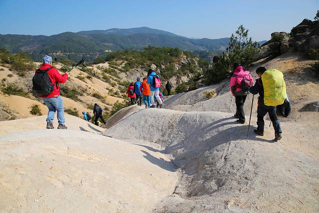 D2:12月13日 0:30到达天台山桐柏岭脚村,住宿农家、帐篷露营自选;7:30早饭;8:00轻装上路,午餐自备干粮。今天的徒步从桐柏上水库开始,一路沿着水库前行;11:00到达高山沙漠,这是一片大面积岩石风化后形成的特色风景,被驴友无意中发现后成为经典的穿越路线,尽情享受大自然的风光;11:30在高山沙漠路餐,各种美食分享;12:30休息或滑沙自行选择,然后继续上路;14:00进入琼台仙谷景区,一路游玩拍照;17:00回到农家晚餐、休息。