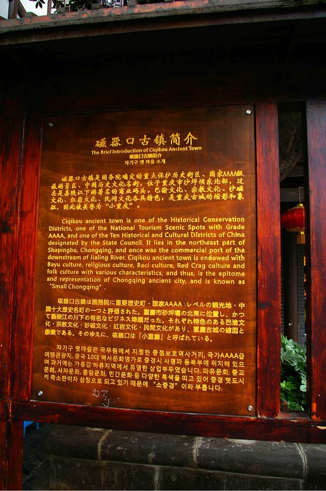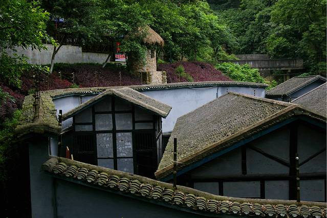 到了磁器口的商业步行街,由于不是周末,人不是很多,但古镇里的商铺云集,进入后的感觉跟丽江古城有些相似,进去不远有个清代名居“钟家院”,可惜已经下班,不能进入,只能在外面看看。