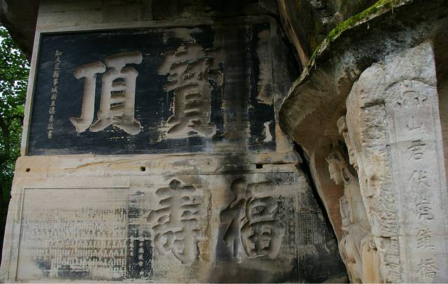 大足石刻始于唐末、宋初时期,以佛教题材为主,宝顶山和北山摩崖造像最为著名,造像最初开凿于晚唐景福元年(公元892年),历经后梁、后唐、后晋、后汉、后周五代至南宋1162年完成,历时250多年。是世界文化遗产。宝顶山石刻是以寿寺为中心的大佛湾、小佛湾造像,分布在东、南、西三面的石崖上,有大型雕刻组图360余幅。