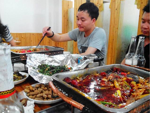 逛完龙水湖,回到酒店休整了下,中午同事亲戚给我们安排的当地最有特色的“肥肠鱼”,离我们住宿的地方开车有十来分钟车程,算是一个农家乐了,沿途卖鱼的鱼庄很多,这里的特色就是吃鱼,“温家肥肠鱼”从外表看上去一般,可是端上餐桌的特色肥肠鱼那是一个地道啊,味道很正、很正,还有配菜是软骨腊肉、牛肉拌辣椒面、蕨根粉丝、青菜汤,看上去就流口水啊,哈哈~~