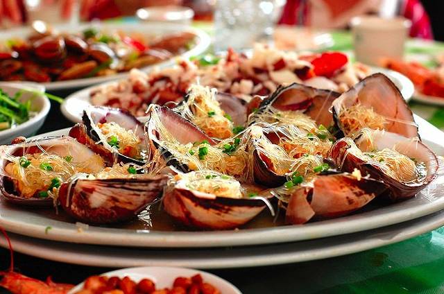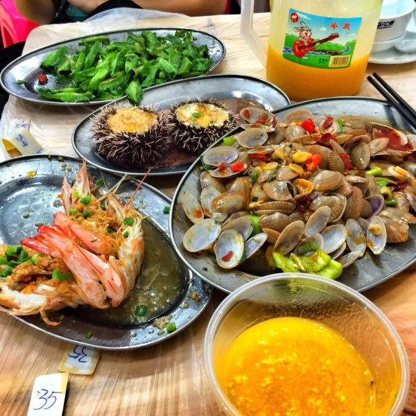 办理入住后我们便2路公交去了第一市场。来这里之前总是听说第一市场的海鲜有多么好吃,刚开始还不信呢,到了就傻眼了,东西多的挑花眼。首先是到海鲜市场挑选海鲜,然后拿到加工店加工,要说的是去第一市场尽量选择耐脏的衣服,因为选海鲜的时候很太容易把衣服弄脏,并且整条街地面都是粘粘的,即便是这样也阻挡不了吃货的心。我们选择的是被很多人推荐的花姐好再来。他家人真的超多,我们是下午四点多去的已经有很多人在吃了。由于我们两个女生饭量都不是很大,所以点的东西不是很多。海胆两个加上芒果螺,单买工25元,明虾是130一斤,我们买了两只是46元,又点了鲜榨芒果汁和四角豆,算上加工费总计171元。其中四角豆是和明虾是蒜蓉
