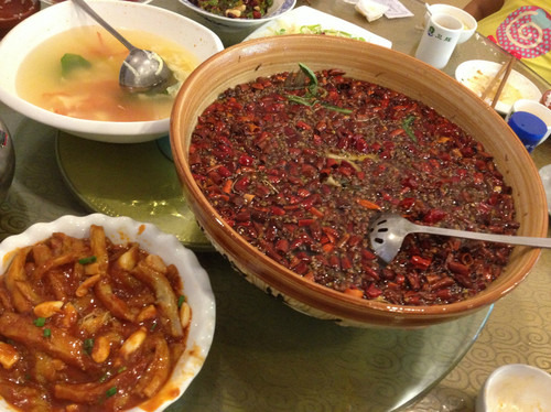 这个分量可不是一般能比的啊,这么多吃到什么时候?不过只是样子吓人,服务员把辣椒舀走后其实里面也就那样,只不过碗比较吓人。