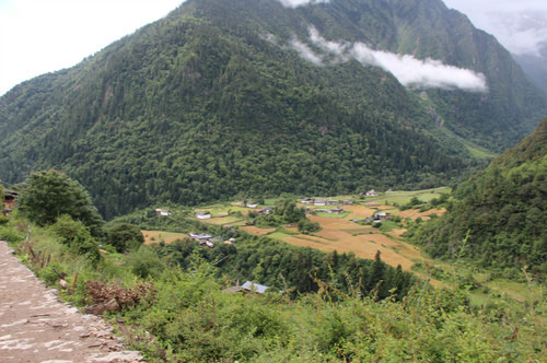 垭口到雨崩是下坡路,我们走的虽然不是很累,但是脚趾头顶的有点痛。