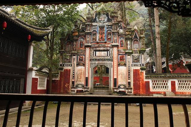 牌坊柱头上分别塑有白象、青狮、麒麟,坊面塑有天官、八仙、童子,“琴棋书画”等塑像。有“五福捧寿”、百吉、方胜、团寿、及龙、凤、双狮图案。中柱楹联为“此地有崇山,左竹右松饶雅趣;其门通径,清风明月证禅心”,次柱楹联为“大道东行,突入西天佛地;鸿恩此至,打开南国禅关。”