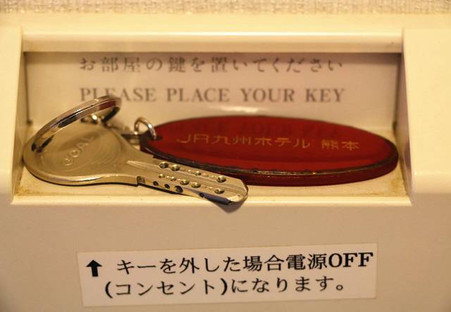 为了节省时间,住在距离JR熊本站步行1分钟的JR九州酒店熊本店,楼下不远处就是电车站。单人间的房间不大,但设施齐全也很舒适,有意思的是酒店的房卡不是IC卡,是传统的钥匙,而且钥匙是放到门口墙上的凹槽内才可以取电。