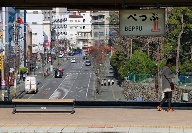 在阿苏站短暂停留,远望了一下阿苏山,就乘九州横断特急4号从熊本县阿苏来到大分县别府,车上是美女列车员检票并推着小车售卖零食,这个和中国也都是一样。绝大多数乘客都在大分站下车了。
