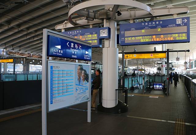 从福冈的JR博多站乘九州新干线燕子325号到熊本站用时44分钟,非常准时。在自由席车厢很容易找到空位,不过28寸的大行李箱不太好找放行李的地方,短途旅行还是中小行李箱为佳。卫生间和洗漱间都非常的干净,需要注意火车上也需要垃圾分类。