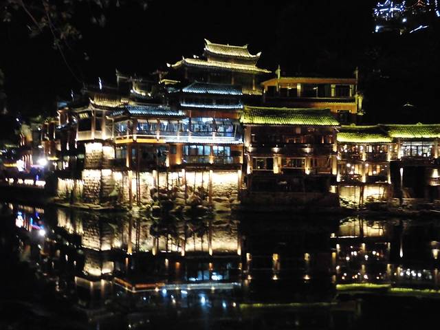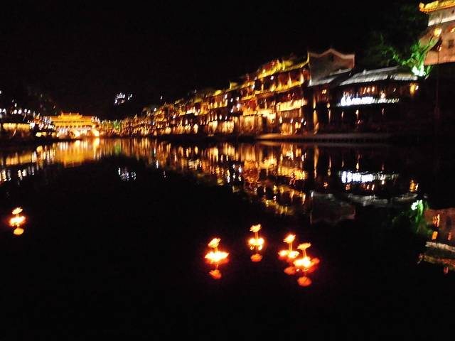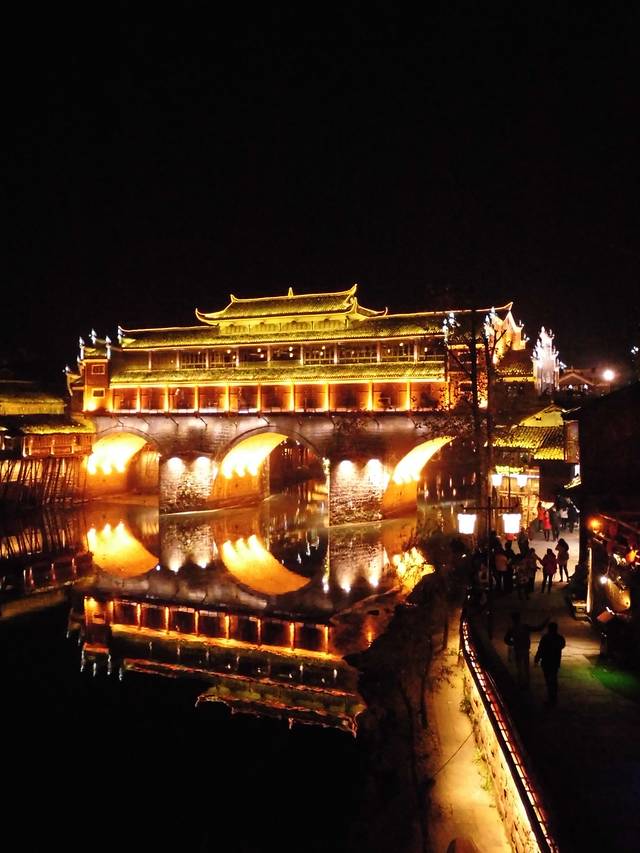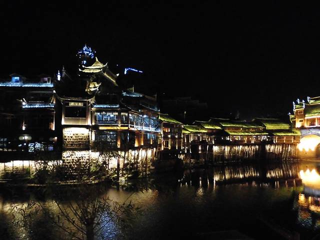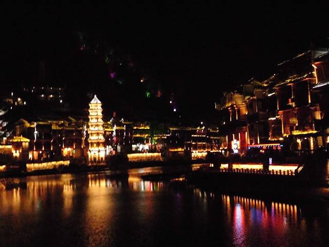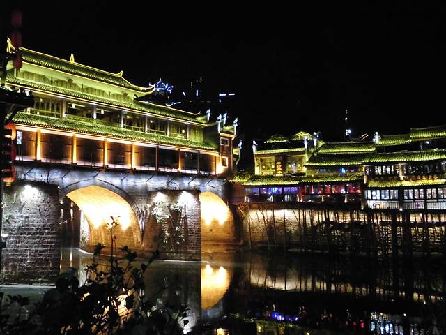 灯火辉煌的凤凰夜城,真的很漂亮,普通的弥红灯,却深刻生动地勾勒出凤凰古城自身的特色和优势,例如独特的吊脚楼,古城风韵