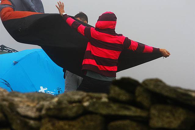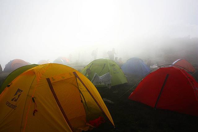 登上金顶的喜悦立刻被随之而来的大雾笼罩,能见度越来越低,赶紧按计划搭起帐篷避寒夜宿。(山下白天34度,山上夜间4、5度,幸好带了厚厚的睡袋)