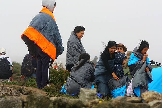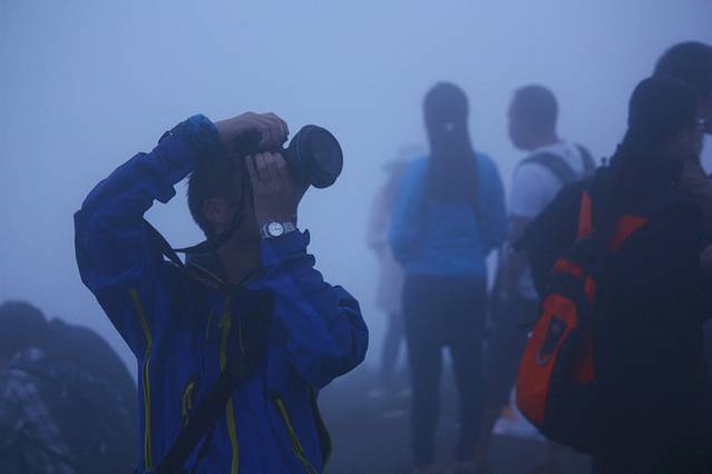 第二天早晨5点钟爬起来看日出,在金顶好多等待的驴友们。木有哇,大雾啊,想看日出下次吧——呜呜呜