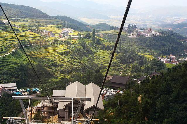 在一级索道厢内鸟瞰武功山下村庄。